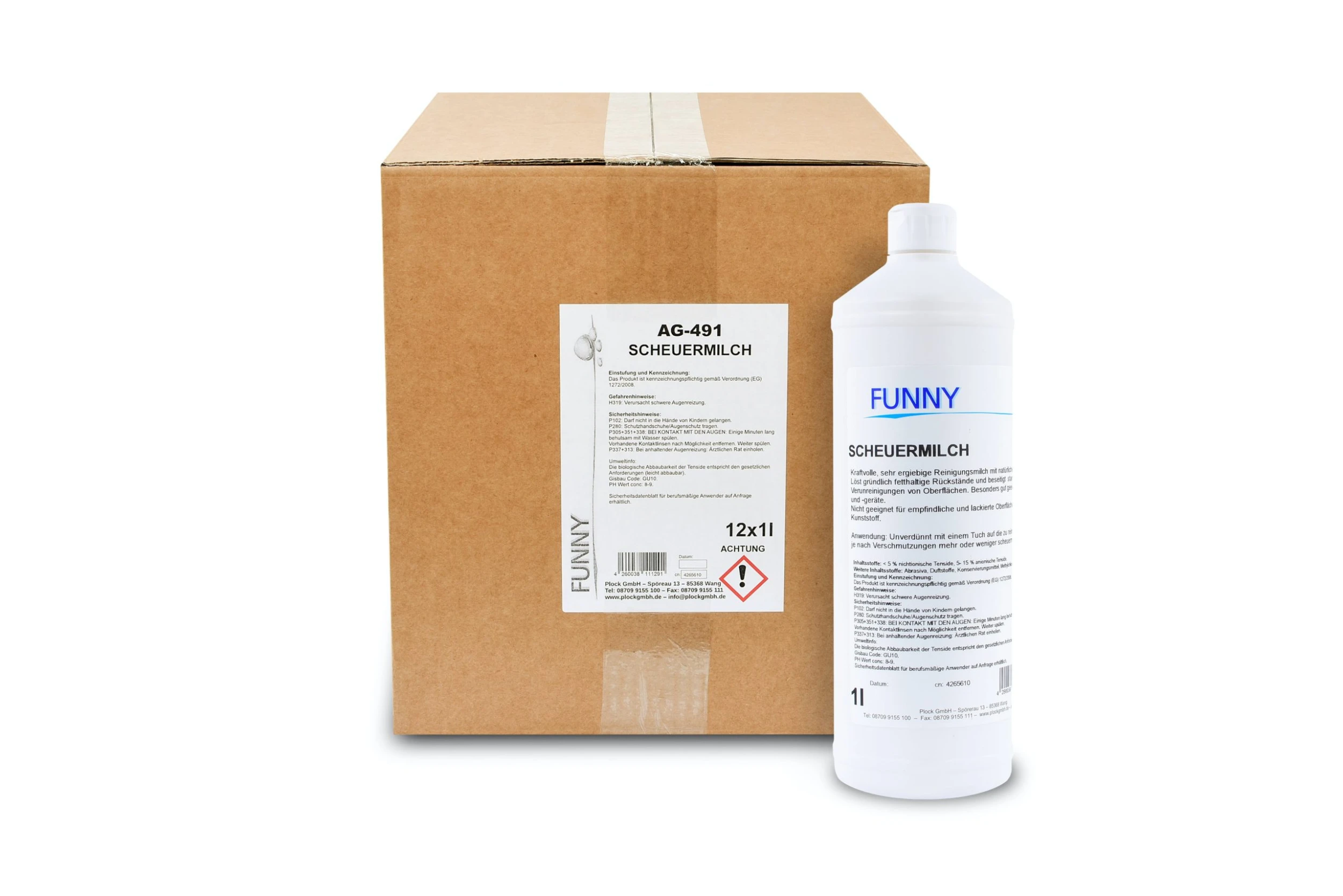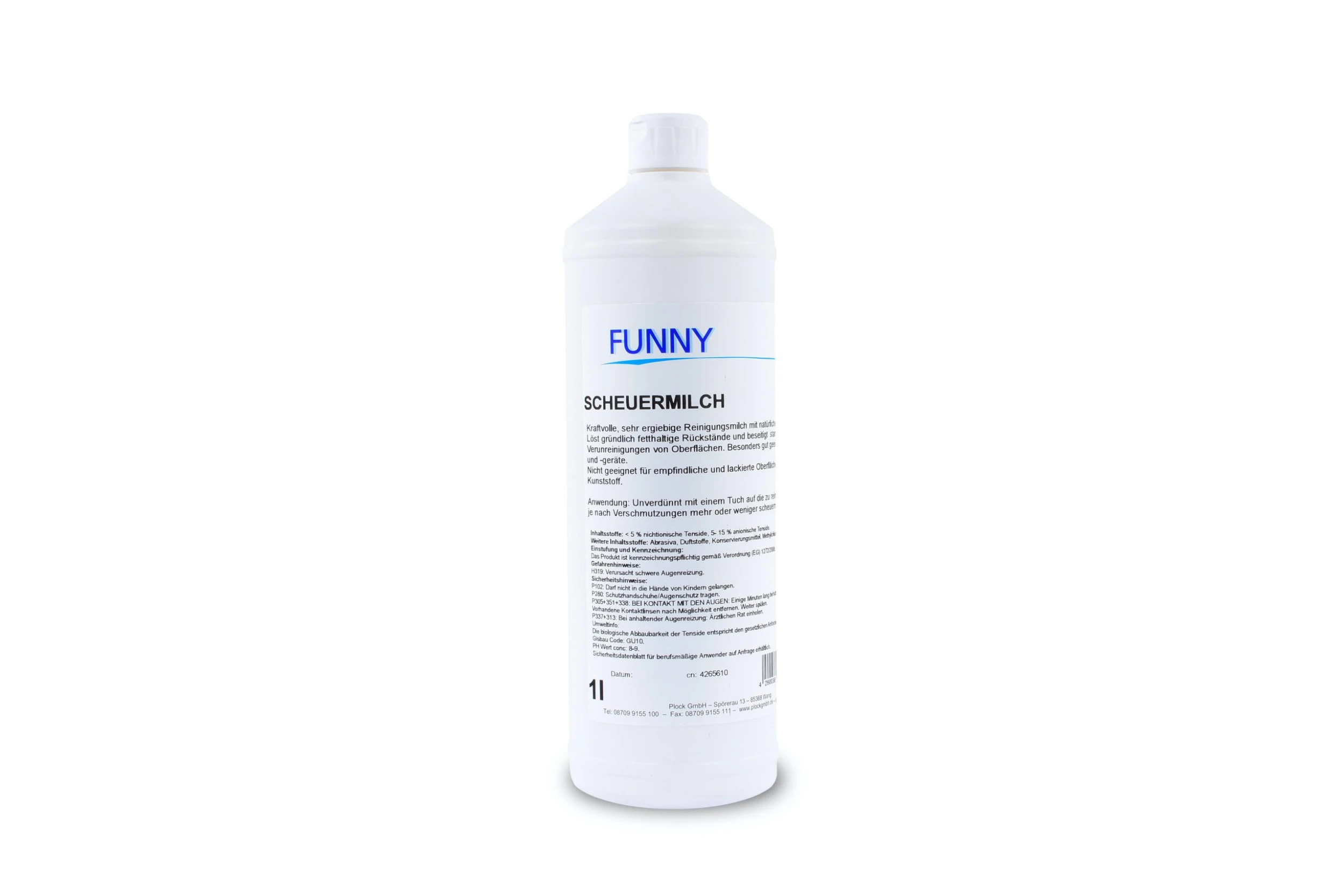 In jeder großen Küche und Kantine wird eine kräftige Scheuermilch benötigt. Sie eignet sich aber auch gut für die Reinigung aller möglichen Bereiche in den Sanitäranlagen von Betrieben. Profis wissen unsere Scheuermilch mit dem natürlichen Schleifmittel und der hohen Fettlösekraft zu schätzen. Mit dem enthaltenen Scheuermittel und dem pH-Wert von 8 – 9 sollte die Scheuermilch nicht auf empfindlichen Oberflächen wie Glas, Acrylglas oder manchen Kunststoffen verwendet werden, da diese verkratzen könnten. Jedoch Fliesen, Kacheln und vor allem Oberflächen aus Edelstahl werden mit der Scheuermilch schnell und gründlich gesäubert, Restablagerungen werden leicht entfernt. Unsere Scheuermilch wird mikroplastikfrei hergestellt, damit die Umwelt nicht unnötig belastet wird. Bitte beachten Sie die Gebrauchsanleitungen und Warnhinweise auf unseren Reinigungsmitteln. Die gute Scheuermilch der Marke Funny kommt in Flaschen mit einem Liter Inhalt. Wir versenden jeweils 12 Flaschen pro Verkaufseinheit.