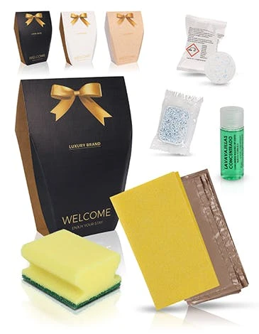 Inhalt: Jede Box besteht aus 5 wesentlichen Reinigungsutensilien in der Küche: 1 gelben Putzlappen, 1 gelben Putzschwamm, 1 Bio Handseife 10gr, 1 Flasche Geschirrspülmittel Bio 30ml & 1 Mülltüte.