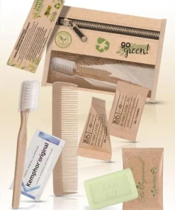 Necessaire bestehend aus Zahnbürste (biologisch abbaubar), Zahnpasta im Sachet, Kamm (biologisch abbaubar), Handseife und Duschgel / Shampoo (2 Sachets). Verpackt in einem Einweg-Necessaire aus Kraftpapier.