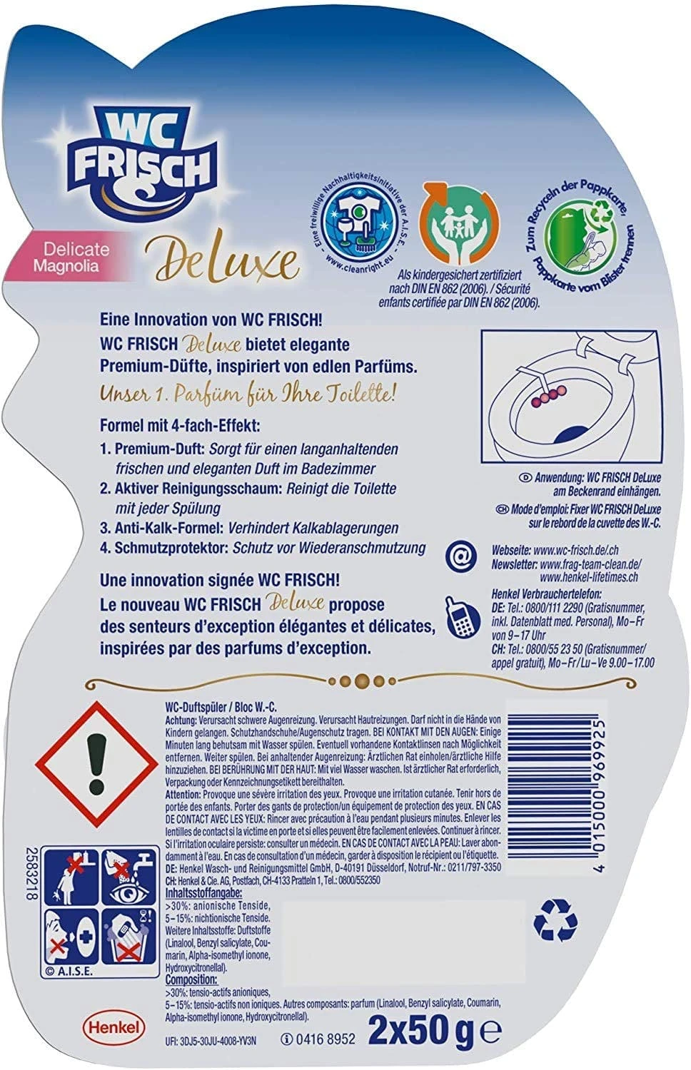 Finden Sie auch, dass Ihre Toilette einen einzigartigen und luxuriösen Geruch verdient hat? WC FRISCH DeLuxe ist das erste Parfüm für die Toilette. Inspiriert von elegant zarten Premium Düften sorgt WC FRISCH DeLuxe für einen langanhaltenden frischen Duft im Badezimmer. Die Anti-Kalk Formel verhindert Kalkablagerungen und der aktive Reinigungsschaum reinigt die Toilette mit jeder Spülung und sorgt so für gründliche Sauberkeit in Ihrem WC. Die spezielle Premium-Verpackung ist außerdem noch recyclebar.